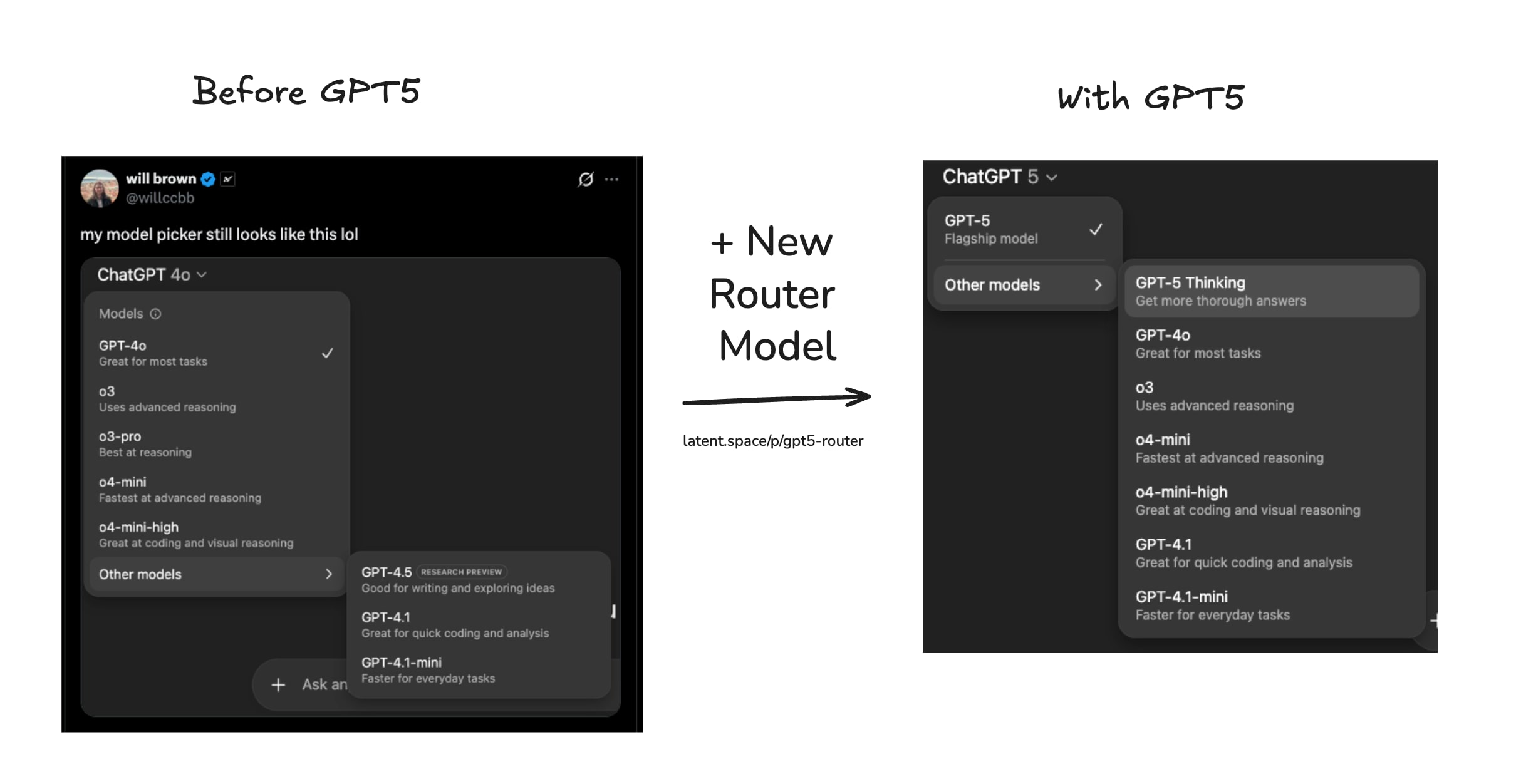 The immediate benefit of the GPT-5 launch is a question of cognitive load - as you can tell the model picker mess weighs heavily on OpenAI and a unified system starts to fix it (even though for developers, control remains as the “model picker” effectively shifts into the new reasoning effort, verbosity, function calling params):