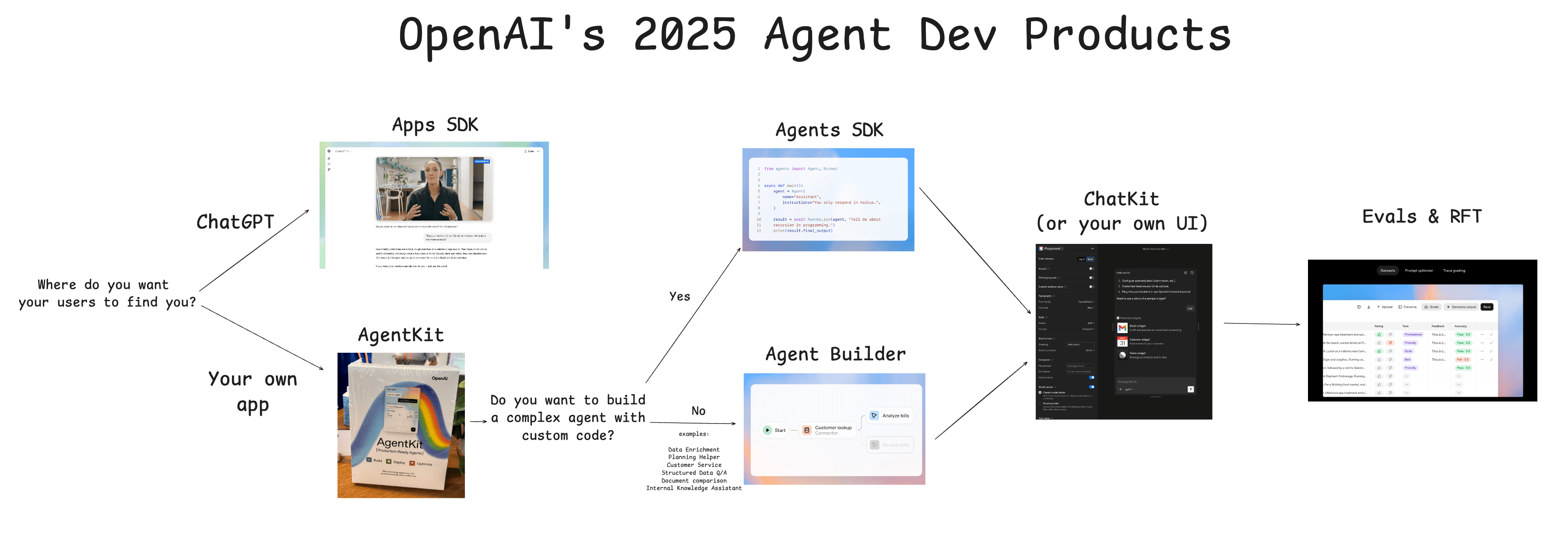 Apart from the Jony Ive and Stargate stories happening offstage, the biggest takeaway from OpenAI’s 2025 Dev Day was how the company is commited to being a proper developer and app distribution platform even as it scales a leading frontier research lab, consumer chatbot, and new social network. For a developer, the number of product names can be a little overwhelming, so we drew you a little flow chart: