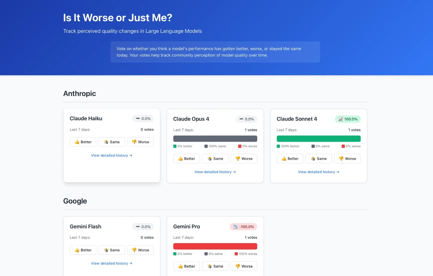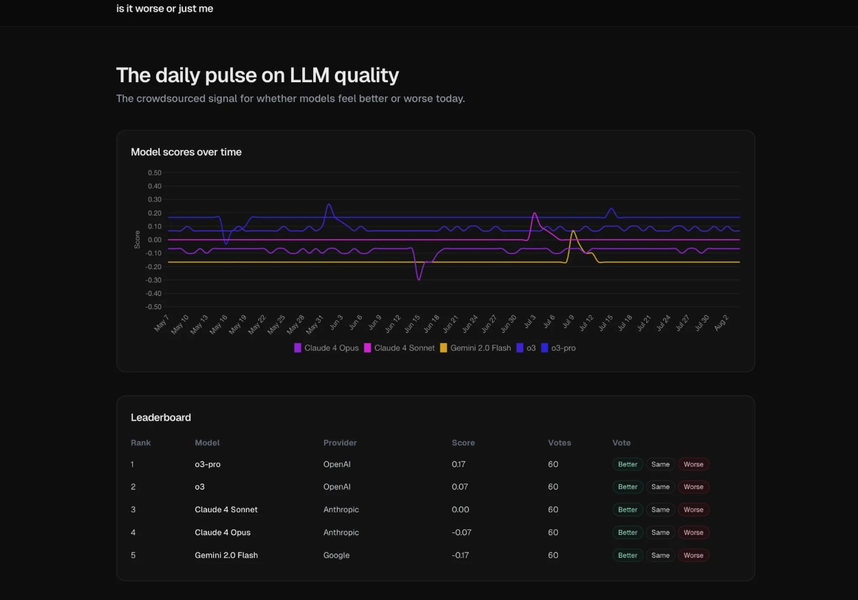 GPT-5 one shots things like no model I’ve ever seen before. I needed to create a complex Clickhouse query to export some data and similarly while o3 struggled, GPT-5 one shotted it. I used GPT-5 in Cursor to make a website I’ve wanted for a while - “Is it worse or just me?” to understand how model quality changes over time. GPT-5 one shotted this website including a SQLite DB:
