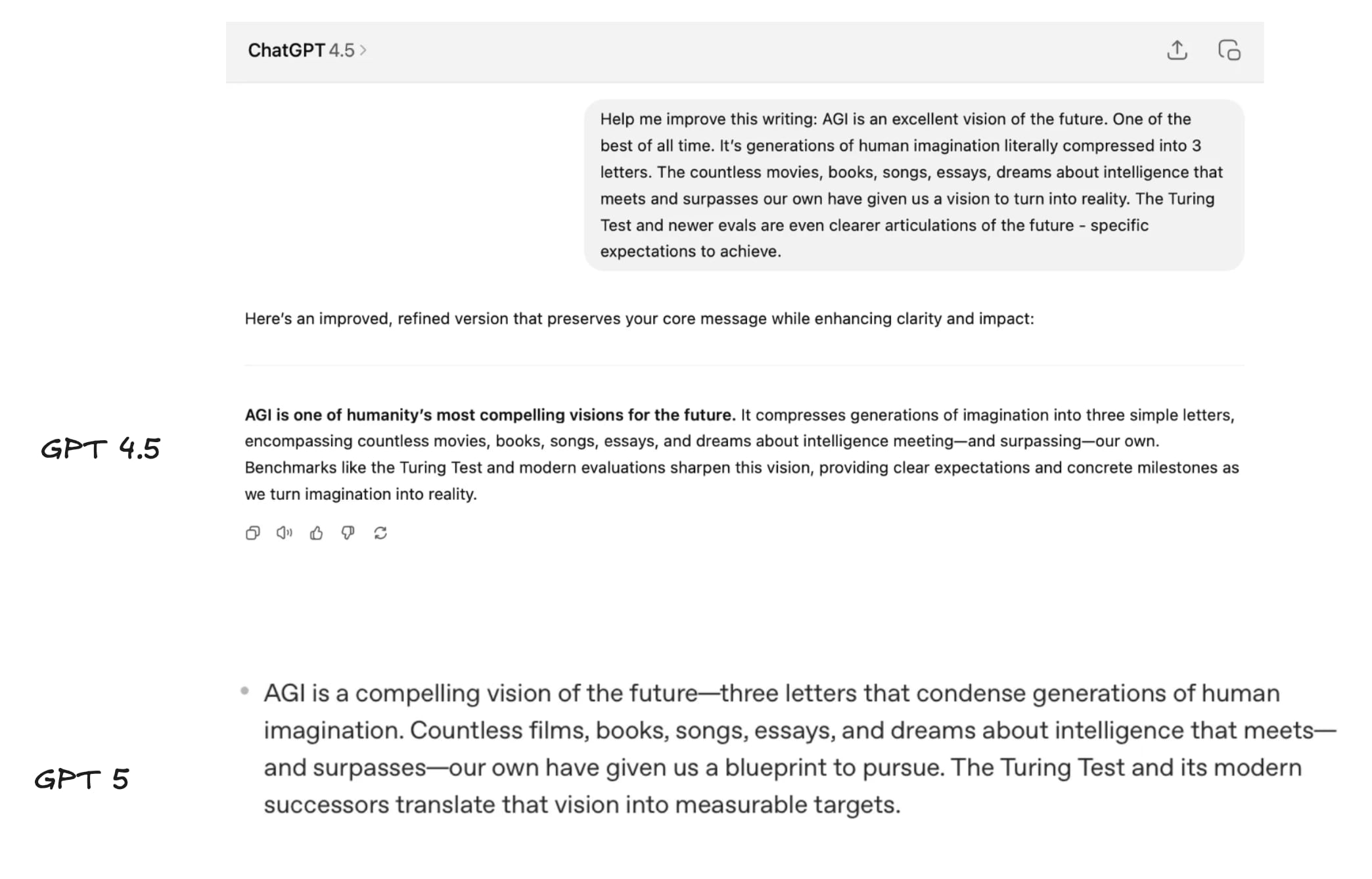 Looking at business writing like improving my LinkedIn posts, GPT-4.5 stays much truer to my tone and gives me portions of text I’d actually use, vs. GPT-5’s more ‘LinkedIn-slop’ style response.