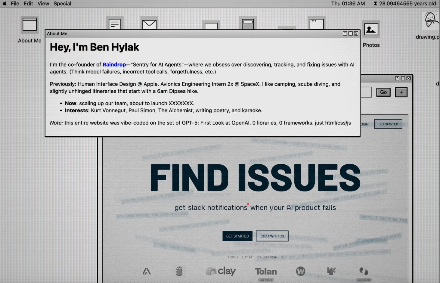 When we were invited to test GPT-5 out early, we all made personal websites. Turns out GPT-5 mostly one-shotted this entire thing, including the paint app. I’ve since added a few more things, like the Photos app + browser, in around ~30 more minutes (very much inspired by RyOS). Amazingly I’ve really never even looked at the code and it’s all just HTML/CSS/JS.