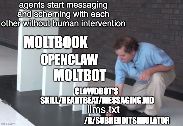 Because this is a low-barrier to entry, human interest topic, you are going to be completely inundated with takes this weekend from every media channel, so we will spare you further elaboration. We’ll just note that folks have made the comparison to the Summer of Simulative AI that called back to 2024 (AIs creating and exploring an alternate universe of things that don’t yet exist), and that this has both an interesting lineage to llms.txt and Moltbook’s conventions already are a far more successful protocol than the A2A Protocol launched last year.
