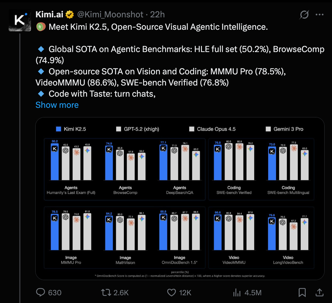Kimi has been on an absolute tear in the past year, and we last heard from them in November with Kimi K2 Thinking. Like K2, today’s K2.5 is still a 32B active-1T param model (384 experts), “built through continual pretraining on 15 trillion mixed visual and text tokens atop Kimi-K2-Base” (which itself was on 15T tokens), and with an EXTREMELY well produced video from their founder (3 minutes, just watch it):