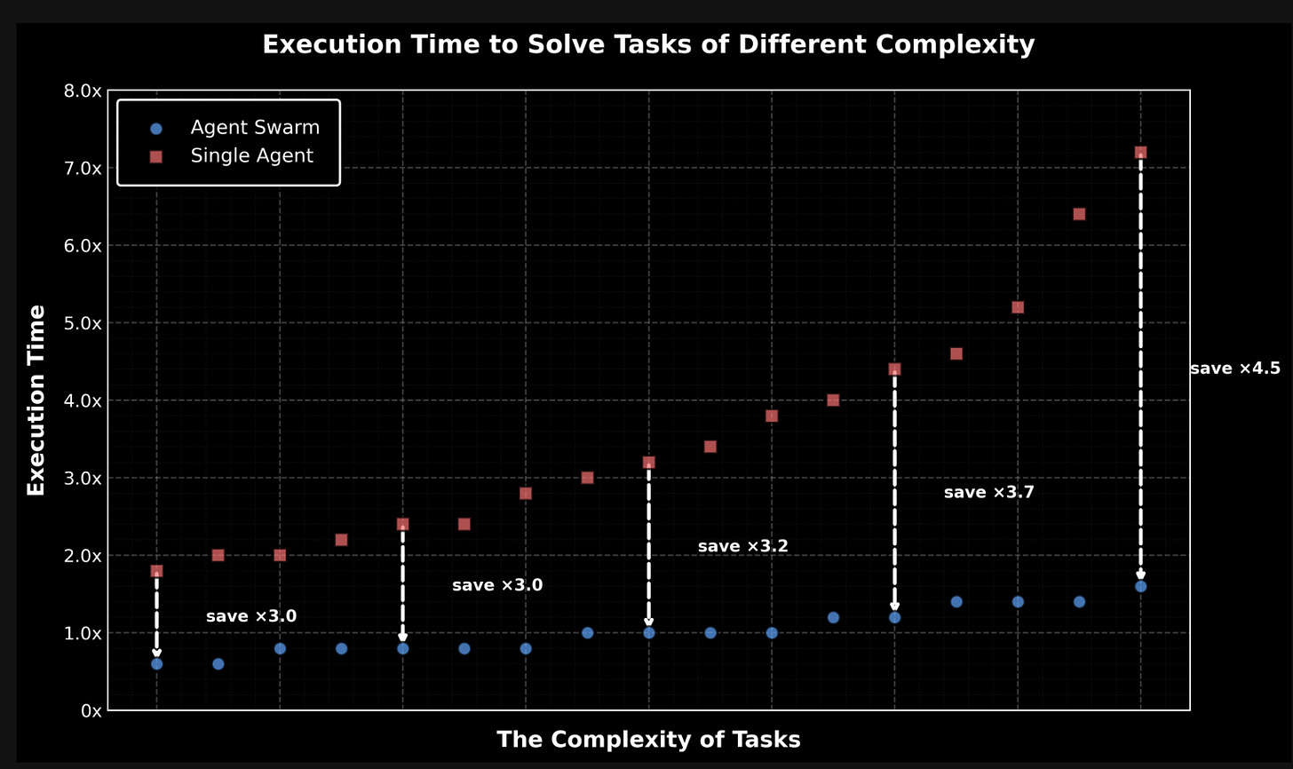 The other 2 headline features are equally exciting: Agent Swarm (only for paid users on the Kimi app) which “learns to self-direct an agent swarm of up to 100 sub-agents, executing parallel workflows across up to 1,500 coordinated steps, without predefined roles or hand-crafted workflows.” This parallelism results in higher end result performance with up to 4.5x faster speed… ignoring token cost of course.